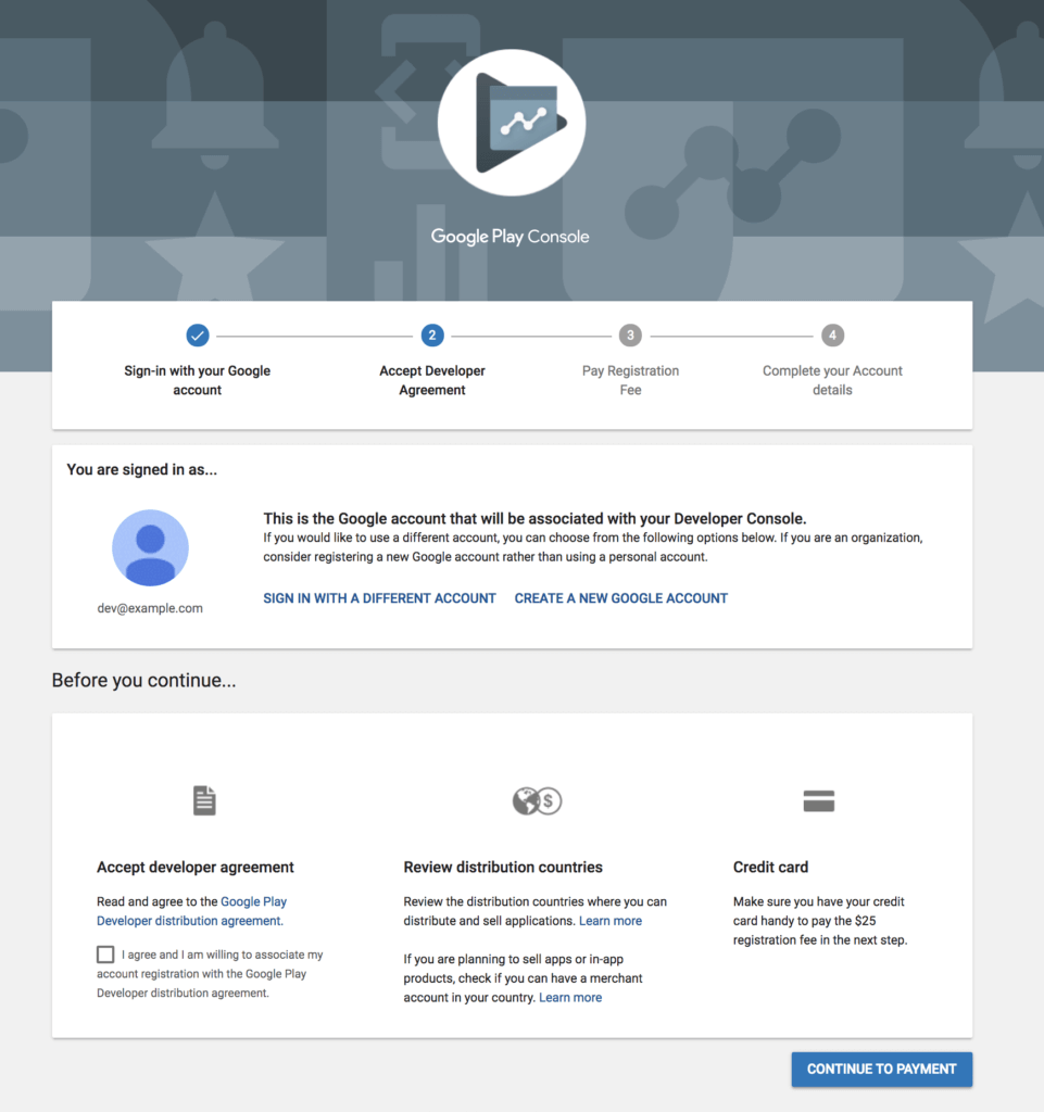 Bạn đăng nhập bằng tài khoản Google như bình thường. Tick vào ô bên dưới “Developer Agreement” để chuyển sang màn hình thanh toán.