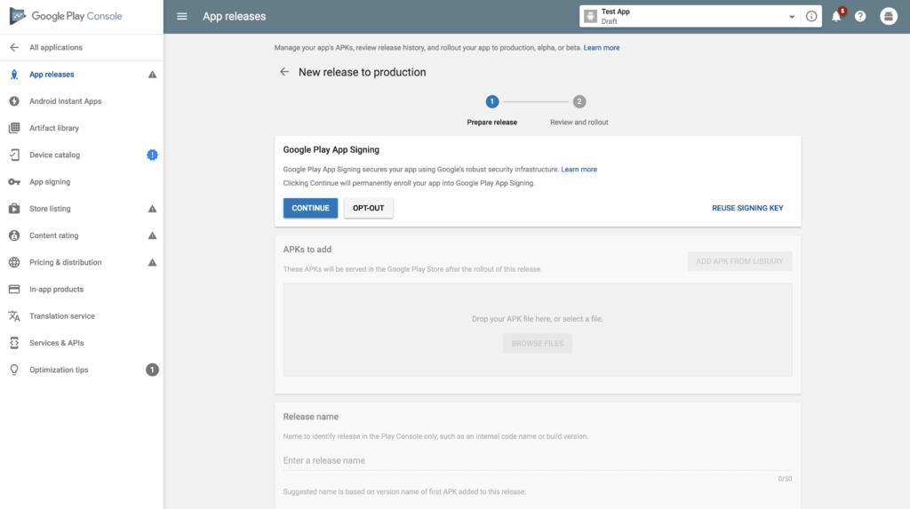 Nếu bạn đã tạo APK có sẵn sign key rồi thì không cần phải làm gì cả, chọn luôn “opt out ”