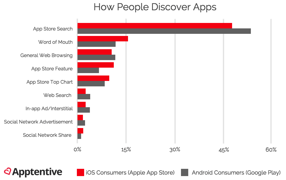 Nhiều khảo sát đã thấy rằng phần lớn người dùng khám phá các ứng dụng bằng cách tìm kiếm trực tiếp hoặc sử dụng các từ khóa có liên quan trong cửa hàng ứng dụng.