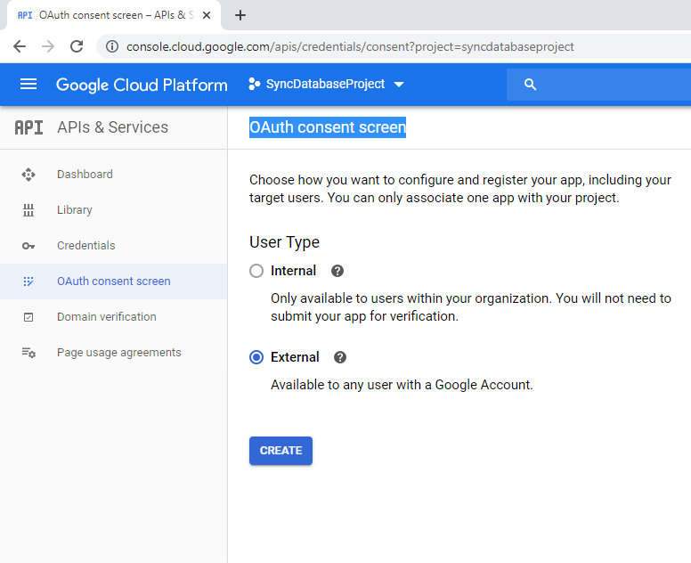 Bước 4: Trong mục OAuth Consent Screen của APIS & Service, chọn External và Create
