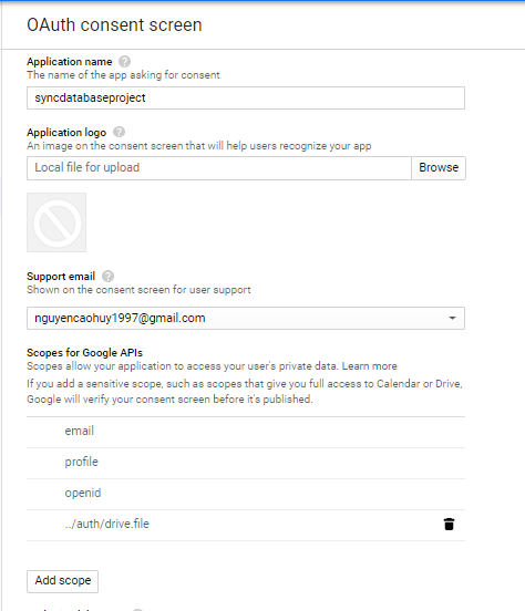 Bước 5: Nhập tên ứng dụng, Add scope và Save