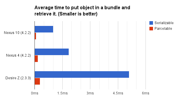 Desire Z Serializable: 5.1224ms - Parcelable: 0.2938ms - 17.36x improvement.