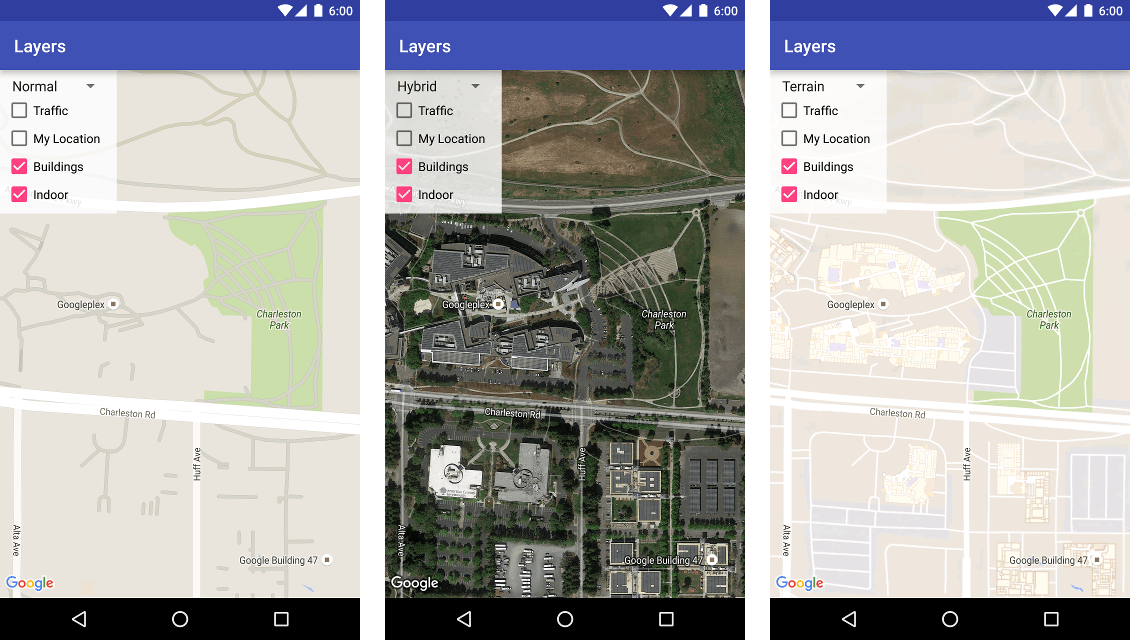 Có 1 số kiểu map được cung cấp sẵn: bình thường, Hybrid, vệ tinh, địa hình, và kiểu trống. Hãy thay tham số trong hàm setMapType() bằng các hằng số MAP_TYPE_… trong class GoogleMap để thử nghiệm. Dưới đây là hình map thường, Hybrid và địa hình:
