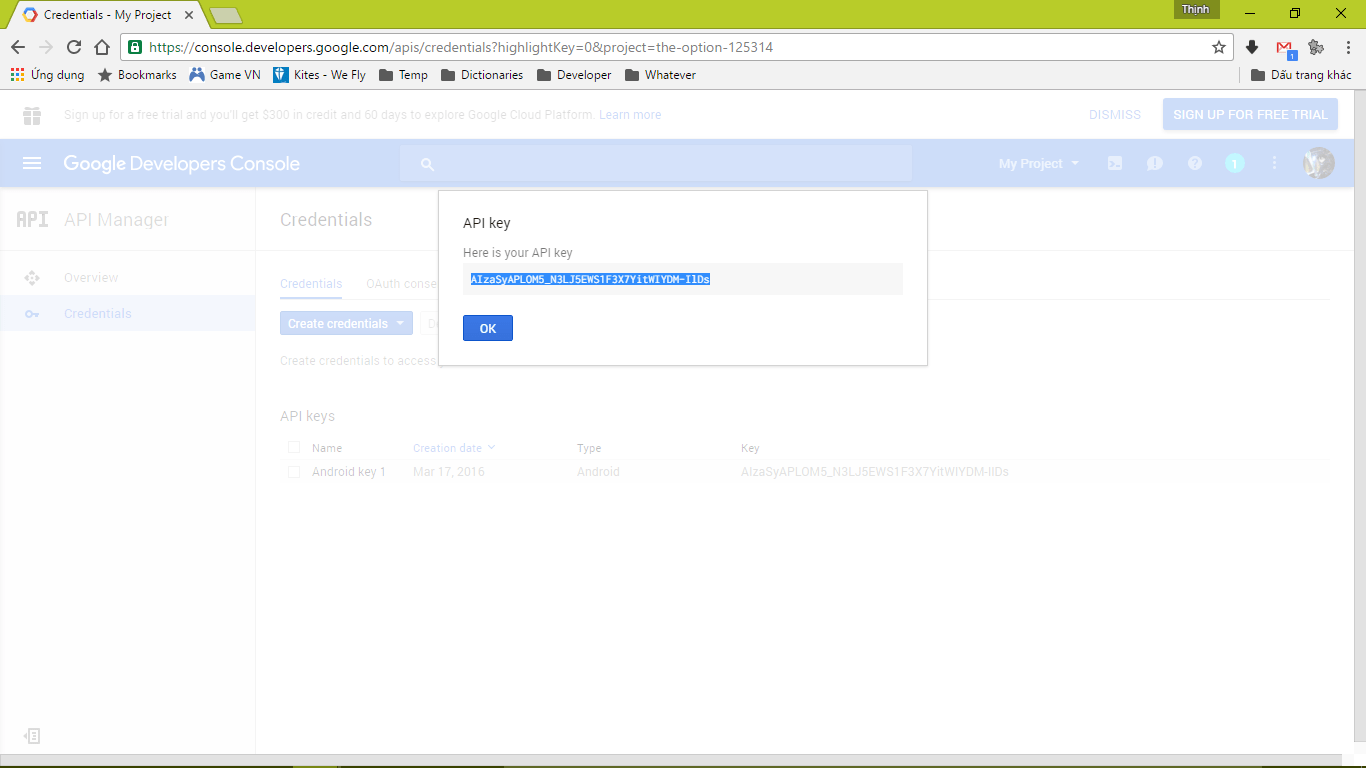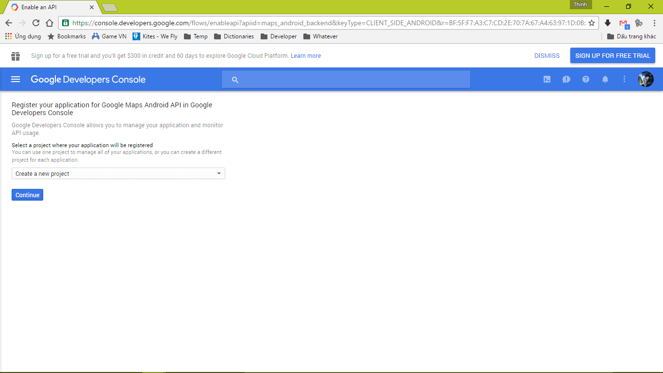 Copy đường link ở dòng thứ 3 và dán vào trình duyệt, bạn sẽ được đưa tới trang Google Developers Console để tạo project API cho ứng dụng của bạn.