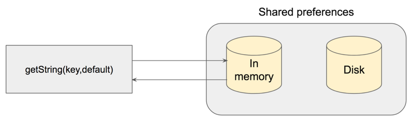 Bạn có thể hình dung cấu trúc bên trong Shared Preferences là một bộ nhớ in-memory (RAM) đặt trên một bộ nhớ disk-storage (External Storage). Mọi thao tác đều đi qua bộ nhớ in-memory đầu tiên sau đó mới đến disk-storage trong trường hợp cần thiết.