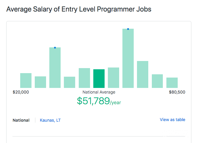 Như tôi đã đề cập trước đó, mặc dù các lập trình viên mới bắt đầu kiếm được ít tiền nhất trong lĩnh vực này vì họ mới có kiến thức về lập trình máy tính cơ bản, tuy nhiên, tiền lương của họ vẫn có thể được coi là nhiều hơn mức khá. Vậy mức khá là bao nhiêu? Theo ZipRecruiter, mức lương khởi điểm của lập trình viên máy tính trung bình là khoảng 52.000 USD mỗi năm, tương đương với hơn $ 4300 một tháng.