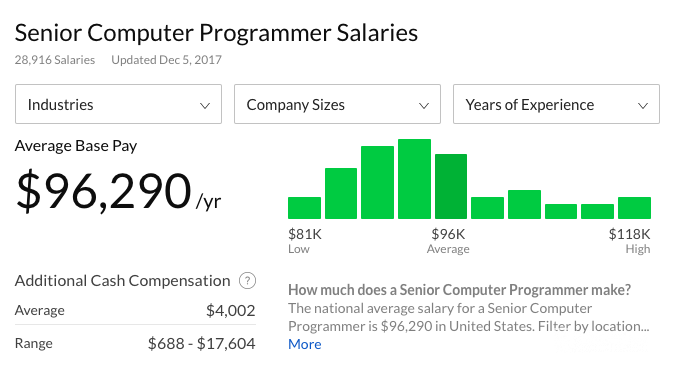 Cuối cùng, chúng ta sẽ nói đến lương của computer programmer có nhiều kinh nghiệm. Mức lương dưới đây là con số mà rất nhiều người đã đưa ra khi họ hỏi được các lập trình viên có nhiều kinh nghiệm. Con số này cũng có thể được coi là một trong những động lực chính để người học lập trình máy tính cả ngày lẫn đêm để trở nên giỏi hơn về kỹ năng rồi trở thành lập trình viên cao cấp vào một ngày không xa.
