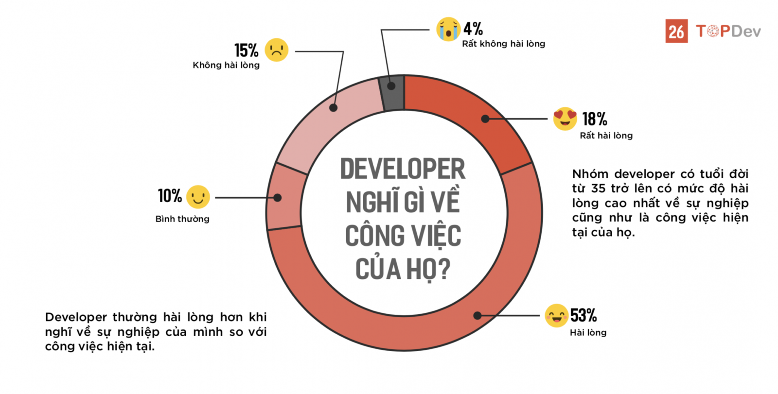 Ngoài ra, khảo sát của TopDev cũng chỉ ra rằng, có đến 33.9% lập trình viên hướng tới việc phát triển những công nghệ chuyên sâu, 25% lập trình viên mong muốn hướng tới cấp quản lý. Trong đó, có đến 53% đang hài lòng với công việc của mình, 59.8% đang không có nhu cầu đổi việc. Vì vậy việc tuyển dụng ở các công ty sẽ trở nên khó khăn hơn trong năm 2019, đặc biệt là ở những vị trí cao cấp như Project Manager, dù mức lương có lên đến gần 40 triệu/tháng ($1,563).