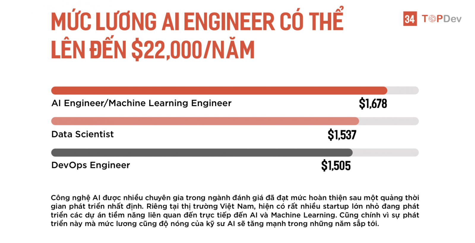 Trong khi đó, giai đoạn 5 năm gần đây thì công nghệ AI (trí tuệ nhân tạo) được nhiều chuyên gia trong ngành đánh giá đã đạt mức hoàn thiện sau một quãng thời gian phát triển nhất định. Riêng tại thị trường Việt Nam, hiện có rất nhiều startup lớn nhỏ đang phát triển các dự án tiềm năng liên quan đến trực tiếp đến AI và Machine Learning tạo được nhiều giá trị đột biến cho toàn ngành công nghệ nói chung. Cũng chính vì sự phát triển này mà mức lương cũng như độ nóng của kỹ sư AI được dự báo sẽ tăng mạnh trong những năm sắp tới.